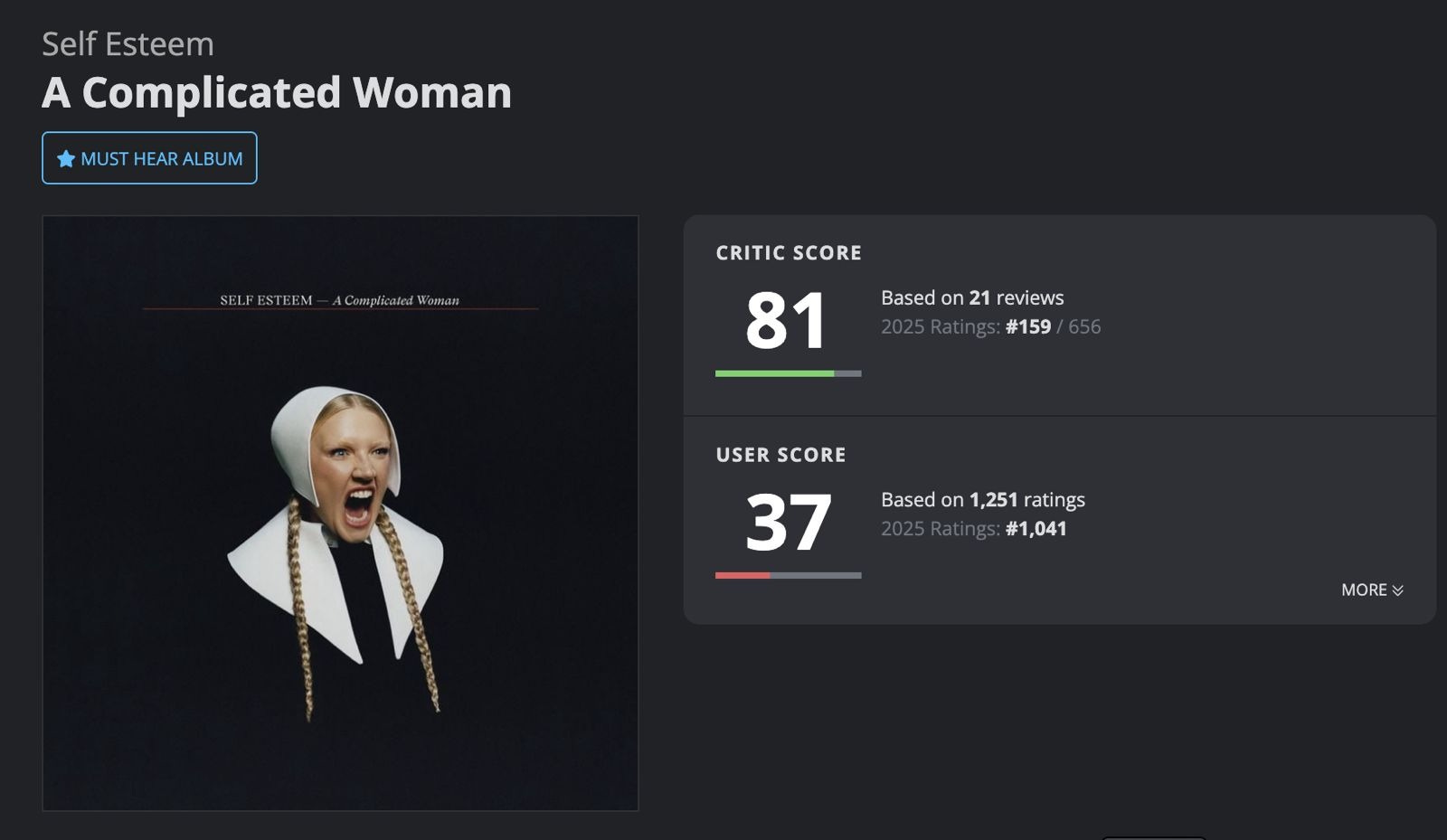 Cuando la británica Rebecca Lucy Taylor aka Self Esteem publicó su tercer disco en abril de 2025 me quedé perpleja: un disco perfecto en fondo y forma tenía un 81/100 de la crítica y un 34/100 de los usuarios. El comentario con más likes venía a decir que “llegados a esta punto creo que paga a los críticos”. Rumié mucho todo y, un mes después, pasó algo parecido con el disco nuevo de Billy Nomates (a la que, casualmente, también admiro bastante). A la tercera, con el de Ezra Furman, lo comprendí todo.